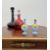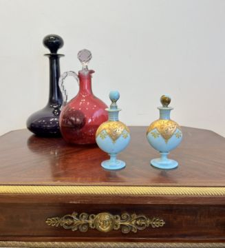 FOUR VARIOUS GLASS DECANTERScomprising a pair Bohemian turquoise glass and gilt decorated miniature bottles, a cranberry glass decanter with faceted stopper and spirally turned handle and a dark blue ship's style decanter,the largest 28cm high (4)