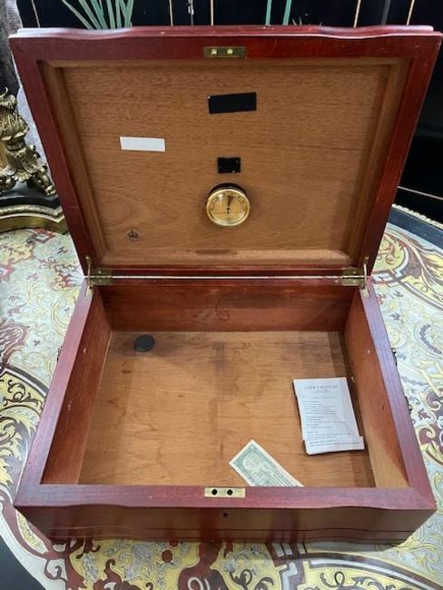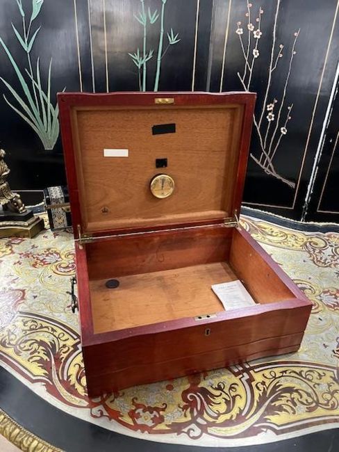 A MAHOGANY CIGAR HUMIDOR WITH HYGROMETER BY FB FRANCEof rectangular form with brass swing handles to the sides, with a hygrometer to the interior of the lid, marked 'FB France', the inside of the lid stamped 'Diamond Crown',42cm wide x 16cm high