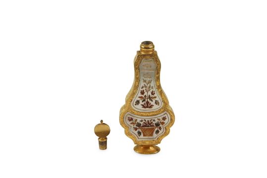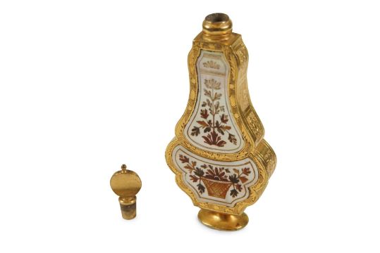 AN EARLY 18TH CENTURY DUTCH MOTHER OF PEARL MOUNTED SCENT BOTTLE C. 1720the body inlaid with mother of pearl panels engraved and painted as a pot of flowers at the base and the centre showing another panel, on a footed base.9.5cm high x 4.5cm wide