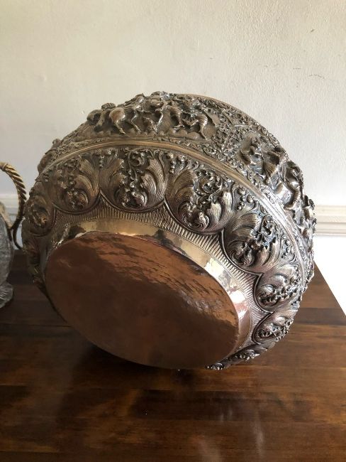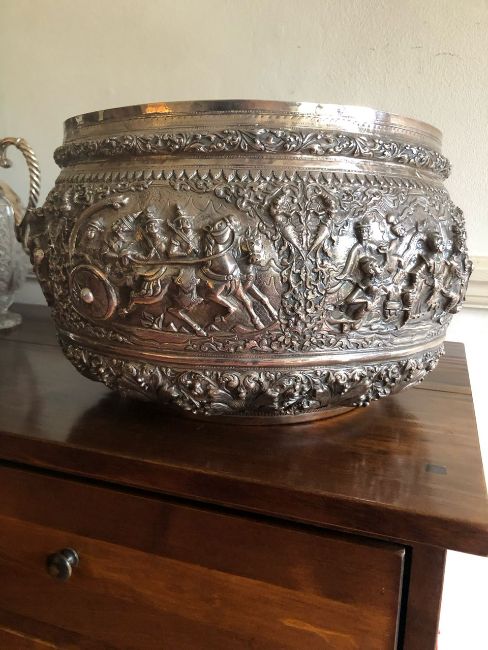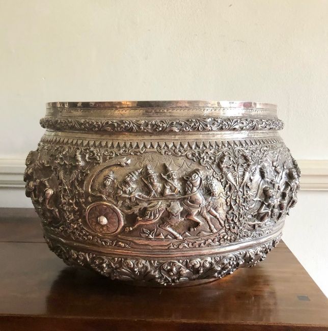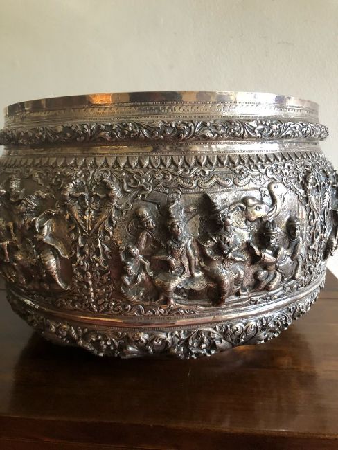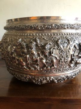 A MASSIVE BURMESE SOLID SILVER BOWLthe antique bowl profusely decorated throughout, 2357 grams in weight23cm high x 37cm wide