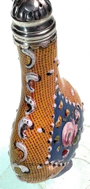 A RARE 18TH CENTURY BILSTON ENAMEL LINEN GROUND SCENT BOTTLE C. 1760the George III period Battersea type enamel and silver mounted perfume bottle with unusual silver mounted screw on stopper, and orange decoration, 8cm x3.5cmProvenance: Nellie Ionides Collection