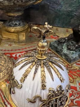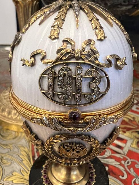 A FABERGE STYLE DIAMOND ENCRUSTED, HARD STONE AND SILVER GILT SURPRISE EGGthe Russian Imperial style 'Easter Egg' with ovoid silver gilt mounted body in translucent white, the hinged cover with a ribbon-tied mount inscribed '1913' and set with diamonds, surmounted by a twin headed, crowned eagle finial, raised on a hardstone plinth (jasper) also with silver gilt mounts, the interior of the egg with a model of a mouse with gem set eyes, bearing psuedo Faberge marks to the inside, mounted in a wooden display case, the egg 580 grams in weight overall,19.8cm high
