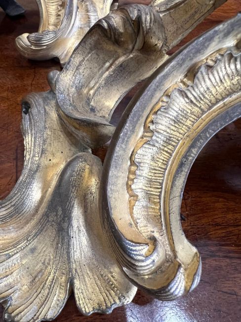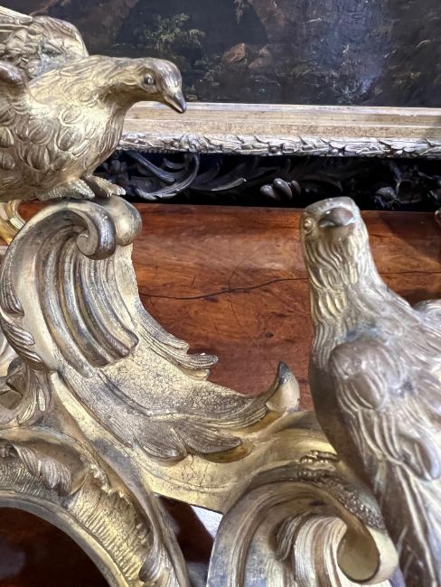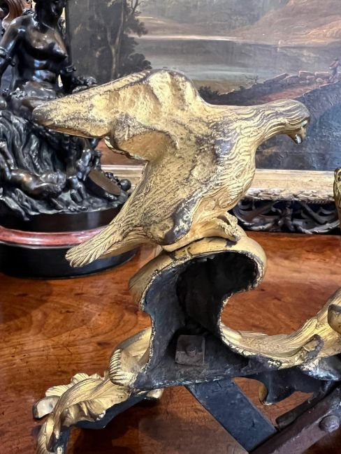 A PAIR OF MID 18TH CENTURY LOUIS XV ORMOLU CHENETScirca 1760, the gilt bronze andirons in the Rococo style, decorated with birds resting on acanthus and C scrolls, the doves feathers finely chased, the iron supports to the reverse,22cm high (2)