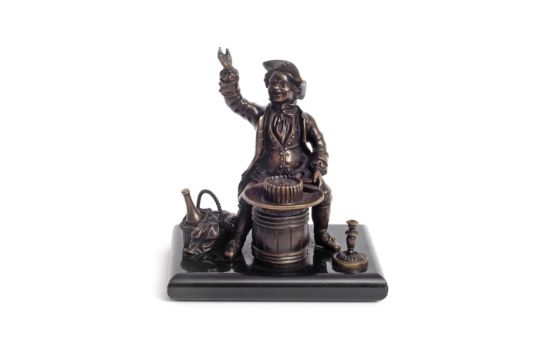 A REGENCY BRONZE PEN HOLDER IN THE FORM OF A JOVIAL GENTLEMANthe early 19th century English model of a seated man possibly a navigator or trader, wearing a tricorn hat and a frock coat, a candlestick to his left and a basket holding a bottle of wine to his right, his supper dish raised on a barrel resting between his legs, his head hinged to contact either pens or matches, raised on a black marble plinth,14cm high x 13cm wide