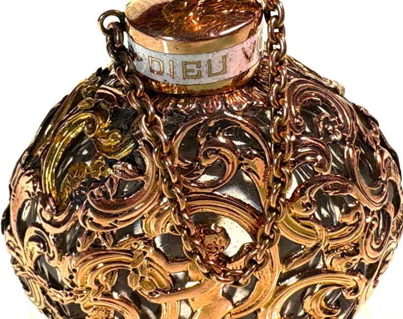 A GEORGE III GOLD MOUNTED BLOODSTONE SCENT BOTTLE, LONDON, C. 1750the mid 18th century Georgian perfume bottle with pierced decoration of strapwork and C scrolls, centred by Putti the stopper with leaf finial,6.4cm high