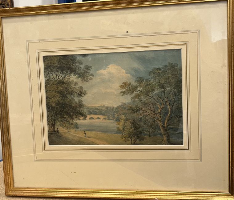 A LATE 18TH CENTURY ENGLISH SCHOOL LANDSCAPEwatercolour, depicting two figures beside a river and wooded landscape, framed and glazed in gilt frame with gallery label to reverse Peter Cardiff, London,55cm x46cm overall