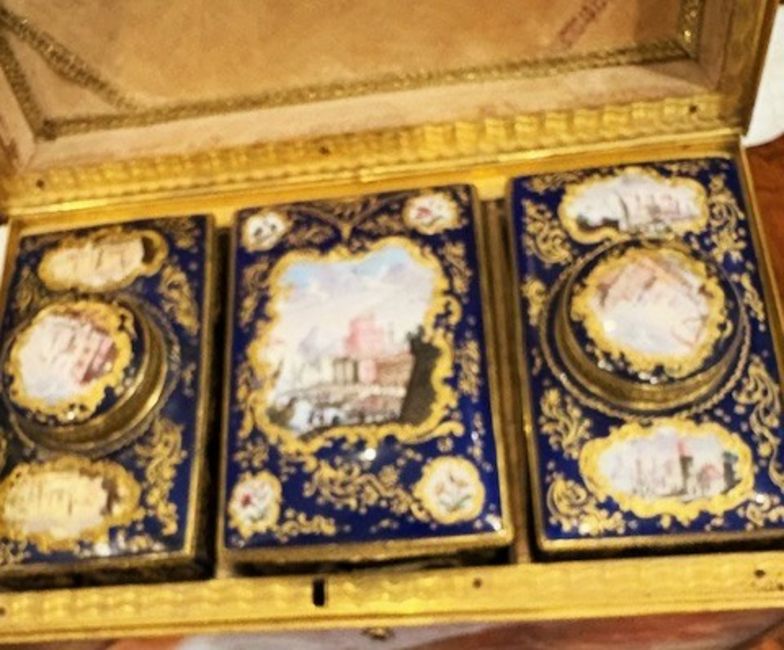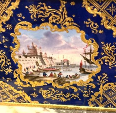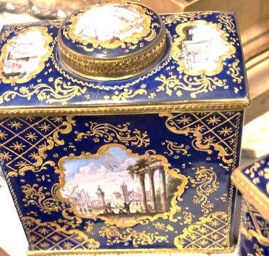 AN EXTREMELY RARE SET OF 18TH CENTURY SOUTH STAFFORDSHIRE ENAMEL TEA CADDIES C. 1765of very large size, on dark blue background with highly gilded Honeysuckle vignettes and with paintings for the Turkish / Eastern Market with highly tooled mounts, mounted within an alabaster and ormolu box,the sugar box is 11cm high x 10cm wide x 6.5cm deep the acaddies are 10cm x6cm x 10.5cm wideHoneysuckle pieces are quite rare this is probably the only Caddies known to have this distinctive design.