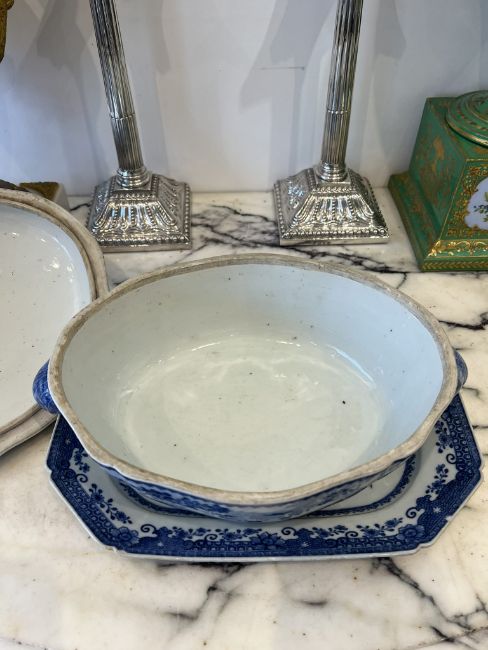A CHINESE EXPORT BLUE AND WHITE PORCELAIN SOUP TUREEN AND MEAT DISHQing Dynasty, 18th / 19th century, both decorated with storks amongst flowers, foliage and stylised clouds, together with a meat dish of similar design, unmarked,the tureen 30cm wide, the dish 32cm wide