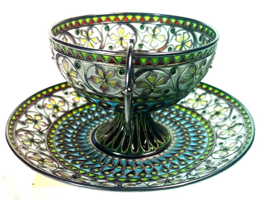 A NORWEGIAN SILVER AND PLIQUE A JOUR CUP AND SAUCER BY MARIUS HAMMER C. 1900the small early 20th century antique cup and saucer of circular form with polychrome enamel decoration, with rope work handle,the saucer 10.5cm