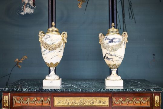 A PAIR OF EARLY 20TH CENTURY FRENCH MARBLE AND ORMOLU VASES AND COVERSin the Louis XVI style, the removable gilt bronze pierced covers with fruiting finials, the veined white marble baluster bodies on spreading socles and square bases, with goat mask handles and floral garland mounts,45cm high (2)