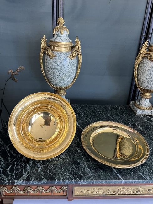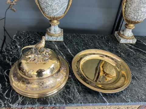 CHRISTOFLE: A 19TH CENTURY GOLD PLATED MEAT DISH AND COVERFrench, the antique circular plate or serving dish with beaded border and recessed centre, with ornate cloche or domed cover over surmounted by a finial modelled as a pheasant on a naturalistic ground, above an egnraved border of trelliswork and flowers and foliage, the domed lid marked CHRISTOFLE 24 / 119174' the dish with engraved motif or rampant dragon, and marked 'CRISTOFLE 52',30cm wide x 23cm high