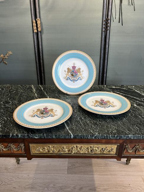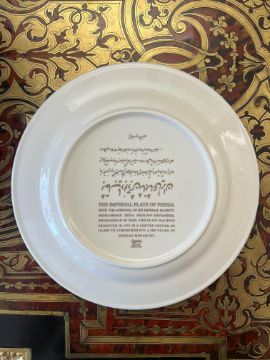 A SET OF THREE IMPERIAL PORCELAIN PLATES OF PERSIA BY SPODEfor the Persian market, the commerorative plate depicting a crest within a turquoise border with gilt highlights, the reverse inscribed 'THE IMPERIAL PLATE OF PERSIA WITH THE APPROVAL OF HIS IMPERIAL MAJESTY MOHAMMAD REZA PAHLAVI ARYAMEHR, SHAHANSHAH OF IRAN, THIS PLATE HAS BEEN PRODUCED IN 1971 IN A LIMITED EDITION OF 10,000 TO COMMEMORATE 2,500 YEARS OF PERSIAN MONARHCY / Spode',27cm in diameter (3)As new condition.