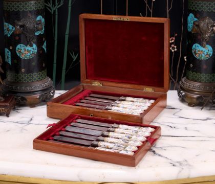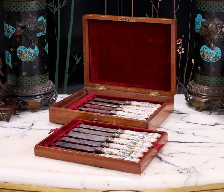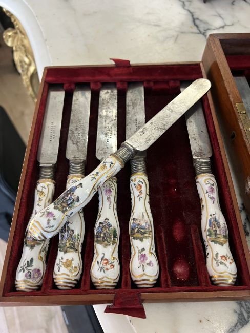 A SET OF TWELVE 18TH CENTURY GERMAN PORCELAIN MOUNTED KNIVES, PROBABLY MEISSENthe handles each decorated with a different scene, six painted with fishermen and boats flanked by flowers and gilt highlights, six with floral decoration to both sides, the steel blades marked for the retailer 'TESSIER 36 NEW BOND ST', in a Victorian mahogany fitted case with velvet lining,each knife 23.5cm in length