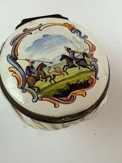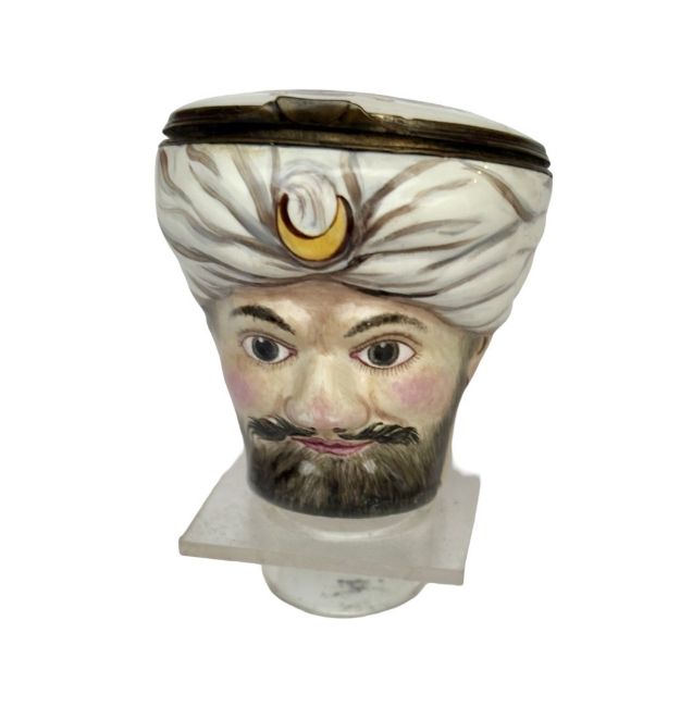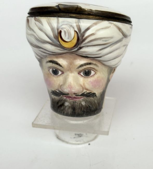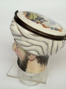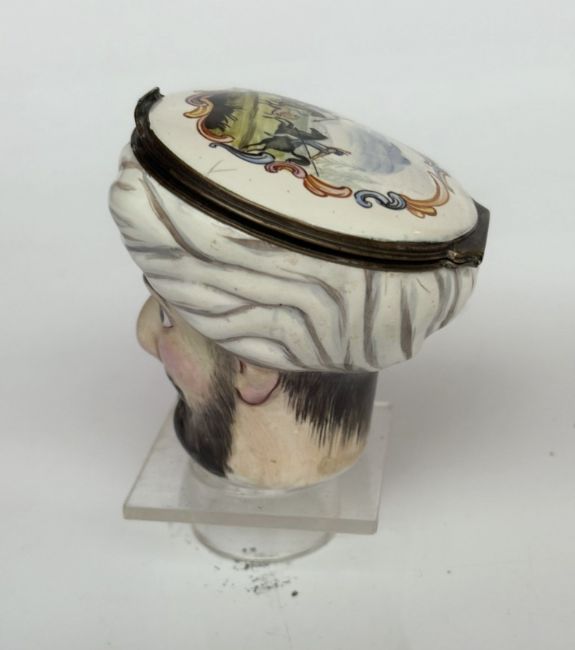 A RARE 18TH CENTURY ENGLISH BILSTON ENAMEL BONBONNIERE DEPICTING A TURK C. 1770-80of large size, made for the Turkish market, the Battersea enamel box modelled as the head of an Ottoman man wearing a turban, the lid is further decorated with a scene of two men on horses hunting a lion within a Rococo C scroll border,9cm high