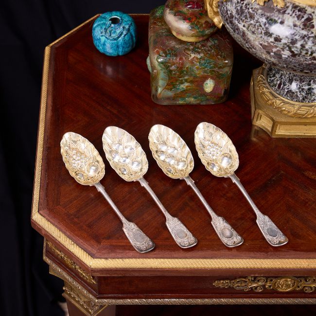 A SET OF FOUR EARLY 20TH CENTURY SILVER AND PARCEL GILT BERRY SPOONSGeorge V period in the George III style, the spoon bowl with repousse decoration of berries and fruit, the handles chased, hallmarked Sheffield 1915, maker's mark C.B. & S.330 grams in weight overall19.5cm in length