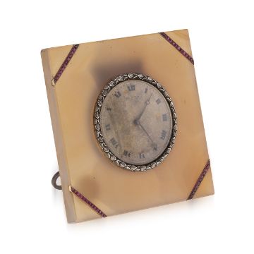 AN EARLY 20TH CENTURY SILVER AND AGATE CLOCK, CALLOW OF MOUNT ST, LONDON, C. 1910the antique early-20th Century Edwardian travel clock featuring a solid silver inset clock with ruby mounted decorations on translucent agate body. The clock has a signed easel on the back and is in working order. Included, the original retailers silk lined case. Signed to the front of the dial, rear of the easel, and the presentation box "Callow of Mount Street, Mayfair".Height: 9.25 cm // 3.64 inches Width: 9 cm // 3.54 inches Depth: 6 cm // 2.36 inches Weight: 315.8 grams // 10.15 oztIn good condition, no damage, just general wear, clock is in fully working order and has been recently serviced.