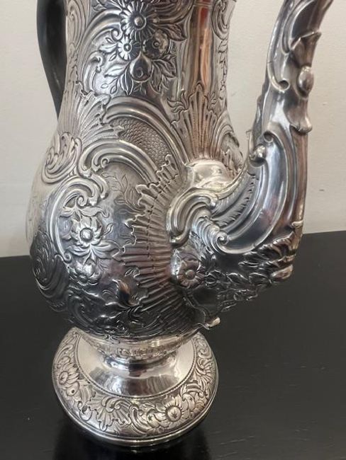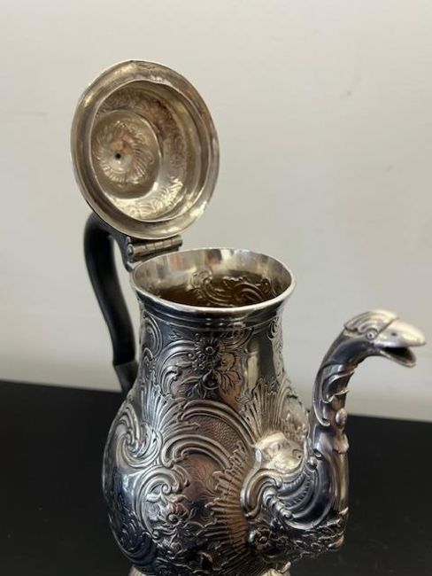 A RARE NEWCASTLE STERLING SILVER COFFEE POT, GEORGE II PERIOD, C. 1757-58the mid 18th century coffee pot in the Rococo style, with scrolling wooden handle, domed hinged cover with urn shaped finial, the spout modelled as the head of a beast, perhaps a griffin, the body richly decorated with rocailles, C scrolls and flowers, with a cartouche with crest of a lion rampant to one side and a dragon to the other, on a circular foot with conforming decoration, hallmarked Newcastle, 1757-58, maker's mark WP for William Partis,975 grams (31.34 oz t.)28.5cm high