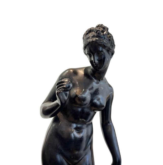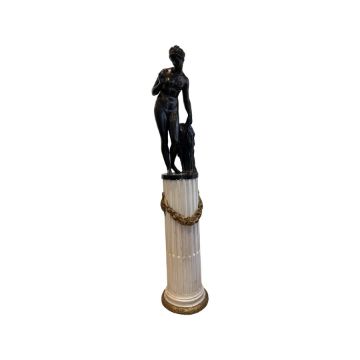 AFTER BERTEL THORVALDSEN (DANISH 1789-1838): VENUS WITH AN APPLE ON PEDESTALthe late 19th century painted plaster figure depicting the nude goddess holding an apple, in st yle of D. Brucciani & Co, black painted, raised on a painted and parcel gilt pedestal column,190cm high overall, the figure 91cm high