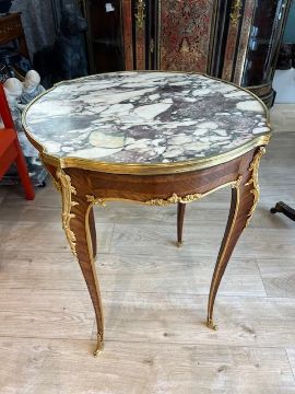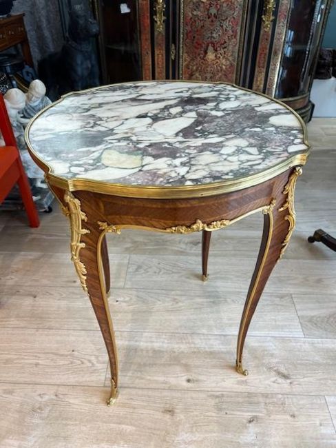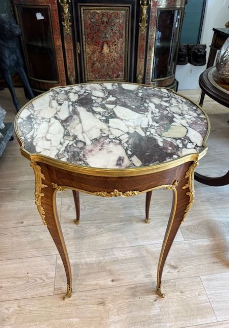 A FINE 19TH CENTURY ORMOLU MOUNTED GUERIDON IN THE MANNER OF FRANCOIS LINKEthe Louis XVI style mahogany and gilt bronze mounted occasional table with breccia marble top, of shaped outline, with foliate mounts to the tapering legs terminating in foliate scroll feet,58cm wide x 77cm highGood condition.