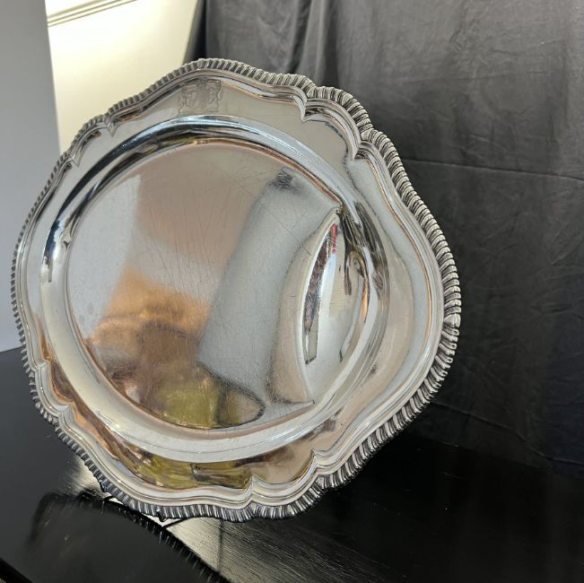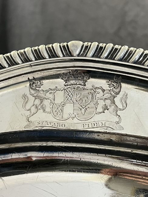 PAUL STORR: A HUGE SILVER VENISON PLATTER MADE FOR JOHN DUTTON, 2ND BARON SHERBORNE, C. 1820the very large antique early 19th century Engilsh George III / Regency sterling silver meat platter or tray of shaped outline with oval centre and sunked well for juices / gravy, raised on ball feet, engraved with heraldic crest with baronial coronet and the motto 'SERVADO FIDEM', (I will keep the faith), hallmarked London, 1820, maker's mark for Paul Storr, 3615 grams (116.22 oz t.)59cm x 44cm x 5.5cm highJohn Dutton, 2nd Baron Sherborne (1779-1862) was married to Hon Mary Curzon, daughter of 1st Viscount Curzon.