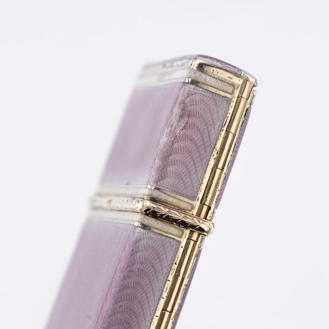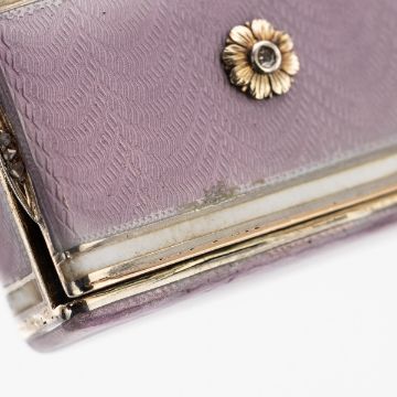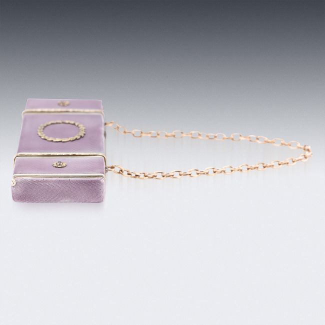 FABERGE: AN ANTIQUE RUSSIAN SILVER GILT, ENAMEL AND DIAMOND NECESSAIRE C. 1900Hallmarked Russian silver 88 (916 standard), St-Petersburg, year 1908, Maker's mark BC for Vladimir Petrovich Soloviev (Владимир Петрович Соловьев), stamped with Faberge retail mark. Antique early 20th Century Imperial Russian Fabergé gilt solid silver & gold necessaire case. Decorated with vibrant mauve enamel over an engine-turned ground, the vanity case is formed of three compartments, each fitted with a small mirror on the underside of its lid. At the centre of two lids sits an applied flower set with an old cut diamond, the center lid mounted with a oval wreath of gold foliage. Each lid is fitted with a diamond-set thumb piece, while a solid gold chain attaches to the top of the case, blending seamlessly with the gold laurel borders that separates each compartment. Height: 1 cm // 0.39 in Width: 11 cm // 4.33 in Depth: 4 cm // 1.57 in Weight: 162 grams // 5.21 ozt Chain Length: 20 cm // 7.87 inIn Good Condition - General wear to the enamel expected with age Vladimir Petrovich Soloviev (1857–1906) was a skilled Russian silversmith who worked closely with the House of Fabergé in St Petersburg. Operating his own workshop, he produced luxury silverware and objets d’art exclusively for Fabergé, marking his pieces with the Cyrillic ВC alongside Fabergé’s stamp. His work included fine silver tableware, cases, tankards, and decorative pieces, often featuring traditional Russian motifs, gilding, and enamel. Much of Soloviev’s output was made for the export market, with a significant portion destined for Fabergé’s London branch, which catered to British and European collectors. His pieces were especially popular abroad, admired for their craftsmanship and character, and remain highly sought after by collectors today.In 1903, Fabergé opened its London branch — the firm’s only outlet outside of Russia. Items for the shop were sent from St Petersburg by registered post and arrived without issue until 1908, when British customs seized a parcel bound for the store. Suspicious of the contents, customs passed the pieces to the Goldsmiths’ Company, responsible for regulating the standards of precious metals in Britain. They found the items lacked the legally required import marks and ruled that Fabergé’s silver and gold pieces must be stamped accordingly.