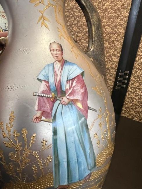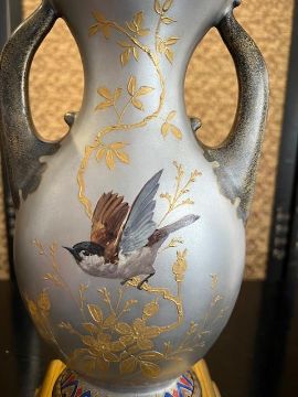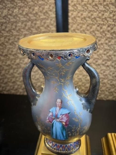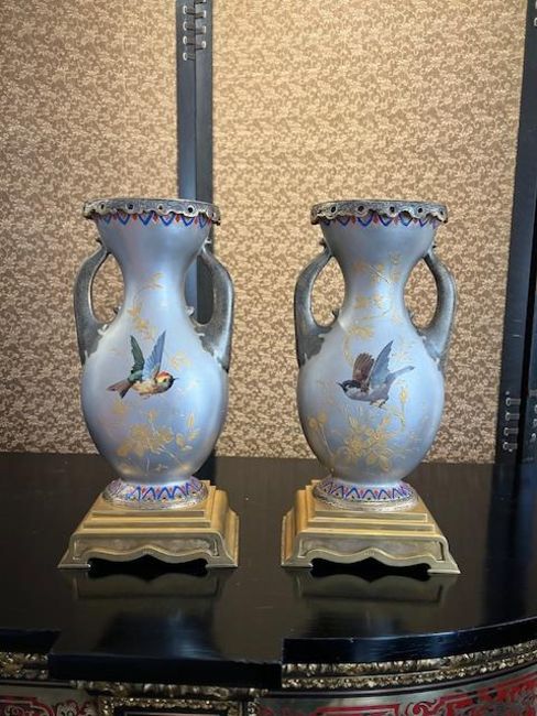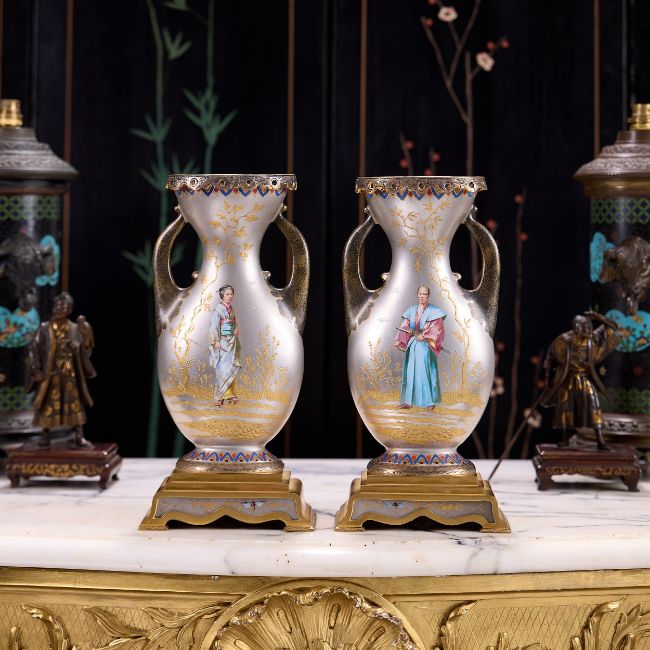 A PAIR OF LATE 19TH CENTURY FRENCH ORMOLU MOUNTED JAPONAISERIE VASEScirca 1875-80, of flattened pear shape with a pair of handles, with silvered and gilt bronze pierced mounts to the rims and raised on gilt bronze bases, each with a porcelain panel with silvered decoration with flowers and moths, the bodies painted with a lady in kimono holding a fan and a male figure with a katana sword, on a silver ground, both depicting amongst gilt trees and foliage, the reverse with painted birds perched on gilt blossom branches,32cm high (2)Good condition.