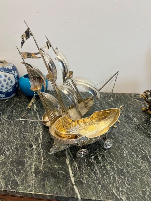 A STERLING SILVER AND SILVER GILT NEF WITH LONDON IMPORT MARKSContinental, probably German, the ship with various masts and flags, the upper section removable from the lower hull of the boat, decorated in relief with putti in a cartouche and raised on four wheels to move around the dining table, with hanging anchor, with London import marks 1974, 925, maker's mark for Israel Freeman & Son Ltd,1335 grams (42.92 oz. t.)44cm high x 37cm wideGood condition.