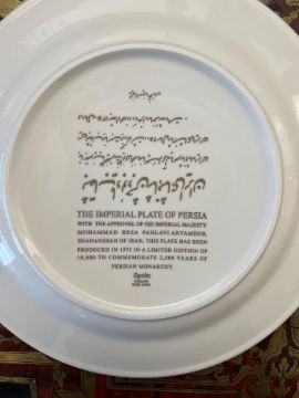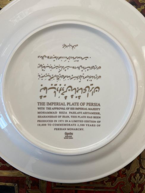 A SET OF SIX IMPERIAL PORCELAIN PLATES OF PERSIA BY SPODEfor the Persian market, the commerorative plate depicting a crest within a turquoise border with gilt highlights, the reverse inscribed 'THE IMPERIAL PLATE OF PERSIA WITH THE APPROVAL OF HIS IMPERIAL MAJESTY MOHAMMAD REZA PAHLAVI ARYAMEHR, SHAHANSHAH OF IRAN, THIS PLATE HAS BEEN PRODUCED IN 1971 IN A LIMITED EDITION OF 10,000 TO COMMEMORATE 2,500 YEARS OF PERSIAN MONARHCY / Spode',27cm in diameter (6)As new condition.