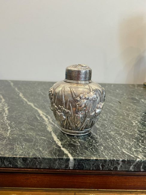 A JAPANESE MEIJI PERIOD SILVER TEA CADDYlate 19th / early 20th century, the body cast with iris flowers against a hammered ground, the cover similarly decorated, the cover concealing a further circular lid with small bun handle within, marked to underside, 255 grams11.5cm high