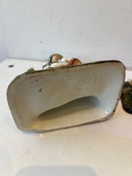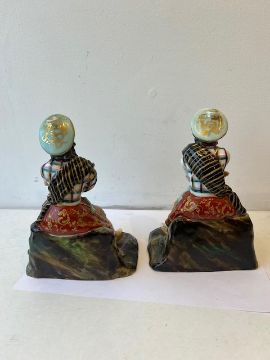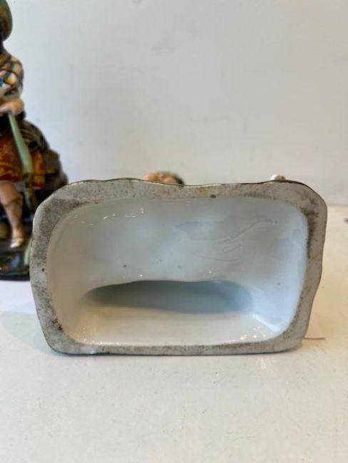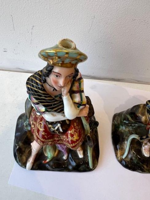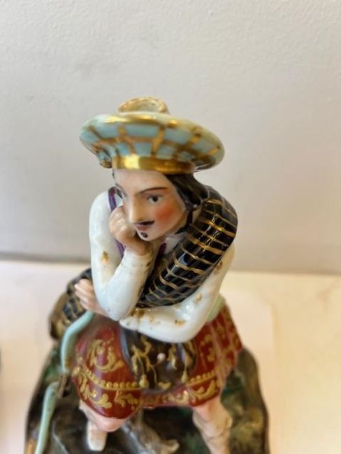 A RARE PAIR OF 19TH CENTURY PARIS PORCELAIN FIGURAL SCENT BOTTLES MODELLED AS SCOTTISH HIGHLANDERSthe scent bottle or flasks modelled as figures of Scots both wearing kilts and seated on a grassy mound with game birds and a rabbit at their feet, with an aperture to the top of their berets, in the style of Jacob Petit, with incised initials J.H, to underside of one,19cm high (2)