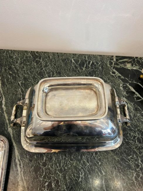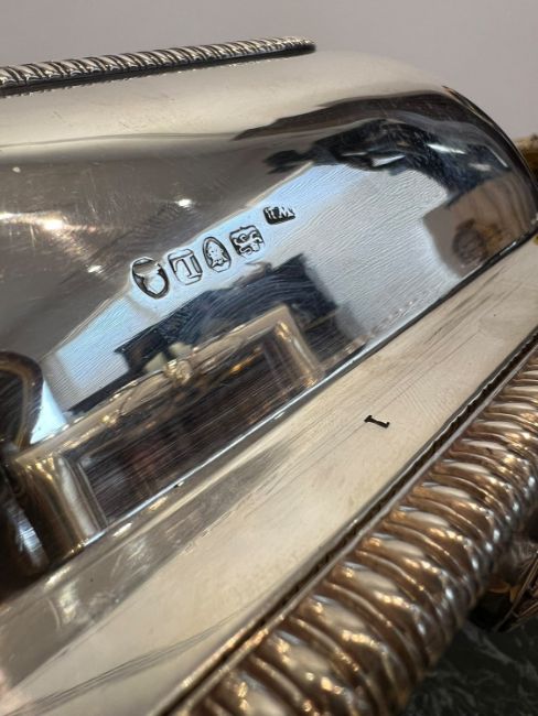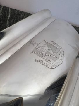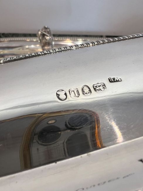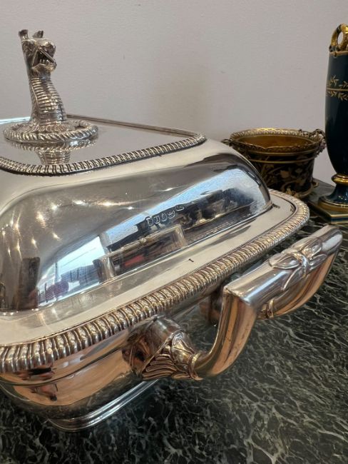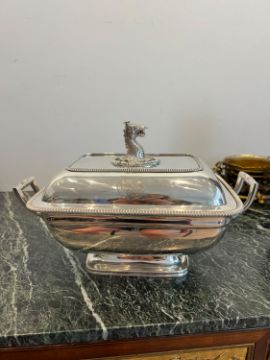 A FINE GEORGE III STERLING SILVER SOUP TUREEN, LONDON, 1806, WILLIAM FOUNTAINof rectangular form with rounded corners, the domed cover surmounted by a handle modelled as the head of griffin in a rope twist border, the cover and body engraved with an heraldic crest and motto "Pro bum non paenitet" translates to "The honest man has not to repent" or "The honest man does not regret" and associated with the Sandys family, the bowl section raised on an oval foot, with a pair of handles to the sides, tureen and cover hallmarked London, 1806, maker's mark for William Fountain,3420 grams (109.95 oz. t.)36cm x 23cmGood condition.