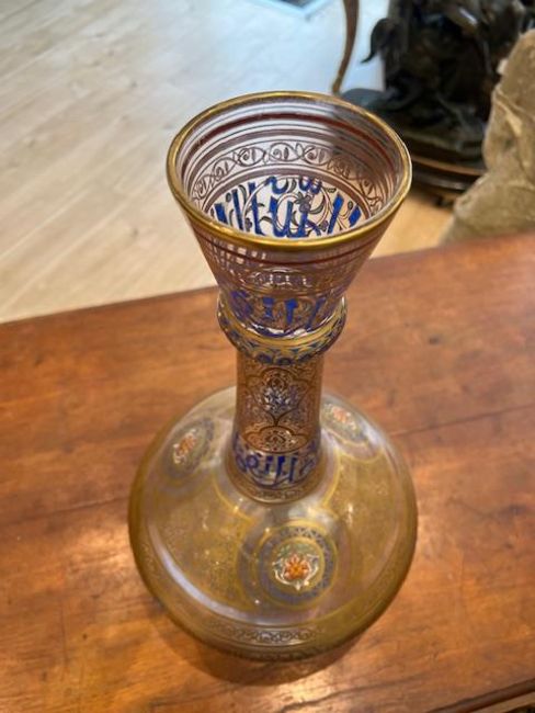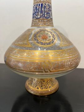 AN IMPORTANT LOBMEYR MAMLUK STYLE ENAMELLED GLASS VASE C. 1878DESIGNED BY JAN MACHYTKA AND FRANZ SCHMORANZthe large 19th century Austrian Bohemian glass vase decorated in the 'Arabian' style for the Middle Eastern / Islamic market, the large vase resembling a mosque lamp, of globular form with long neck and outswept rim, on a conical foot, painted with three medallions each enclosing a stylised flower, flanked by panels of gilt floral decoration above a band of naskh inscriptions, the neck with a Kufic inscription, the underside with the Lobmeyr maker's mark,49cm high A smaller flask by Lobmeyr with almost identical decoration is in the MAK Austrian Museum of Applied Arts, Vienna (Inv. GL 2573)The designers of this important piece were architects Johann Machytka and Franz Schmoranz (1845-1892), they travelled extensively in Palestine and the Middle East and designed for Lobmeyr a number of vessels in 'Arabian style' between 1876 and 1878, drawing their inspiration from original pieces in museums in Cairo and elsewhere. These new designs were much sought after when they were displayed in Paris in the 1878 Exposition. Lobmeyr continued to exhibit at all the major international fairs in the last quarter of the 19th century.The design of this lot is derived from a 13th century Syrian or Mamluk form. For example, see the vessel from the Collection of the Late Baroness Batsheva de Rothschild, sold Christie's London, 14th December 2000, lot 48 and that in the Victoria and Albert Museum, London (Inv. 328-1900).