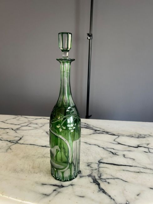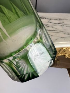 AUGUST BOHM JR: AN ENGRAVED GLASS DECANTER OF RACING THEME C. 1870the equestrian themed green glass decanter and stopper in the Bohemian style, the neck and base cut with vertical flutes, the shoulders with borders of fruiting vines, the reserved panel engraved by August Bohm Jr, signed 'A. Bohm', below, depicting a horse and rider,38cm highIn good condition.This decanter by A. Bohm is of very similar form to a pair sold at Bonhams, one engraved with an Arab horseman, sold London, 1 May 2013, lot 132, £3000. They stated in the catalogue:August Böhm Jr (1848-1910) was taught by his father of the same name. August Böhm Sr (1812-1890) was one of the finest glass engravers of the 19th century. The younger August Böhm settled in England and worked in Stourbridge. It is likely that a series of these distinctive bottle-shaped decanters engraved in the Bohemian style and signed A Böhm are British productions by the younger engraver. Another bottle shaped decanter signed A Böhm, with an identical subject to the present lot, was exhibited by Michael Kovacek, Glass of 5 Centuries, p. 220 (as the work of Bohm Sr). This is illustrated and discussed by Paul von Lichtenberg, Glasgravuren des Biedermeier (2004), p.206, fig. 127 where it is re-attributed to the younger August Böhm. Böhm Jr was clearly a very talented engraver like his father. A blue decanter of the same shape engraved with Flora and Zephyrus is in the Glasmuseum Rheinbach, cat. no.157. August Böhm Jr's own son, Henry also worked as a glass engraver and cameo artist and changed his name to H J Boam