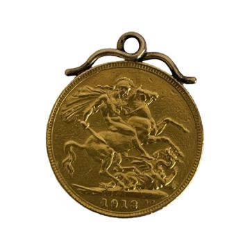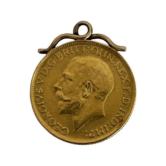 A GEORGE V 22CT GOLD FULL SOVEREIGN C. 1913the early 20th century gold coin weighing 7.98 grams, with 9ct gold mount (unmarked but tested), overall weight 8.33 gramsWe can post this lot insured within the UK for a small fee.