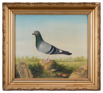 AN EARLY 20TH CENTURY PAINTING OF A RACING PIGEONin the style of Andrew Beer, the sporting painting depicting a carrier or racing pigeon, oil on canvas, signed Gmo. Close, 1924, with a list of various flights, such as St. Denis, St. Quentin, Orleans, etc, in a giltwood frame,the painting 52cm x 46cm, the frame 66cm x 60cm