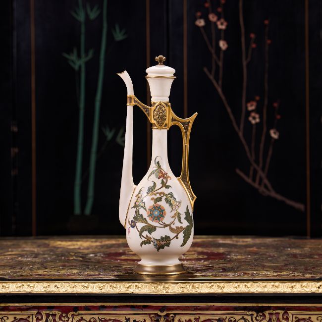 A ROYAL WORCESTER BLUSH IVORY PERSIAN STYLE PORCELAIN EWER C1883late 19th century for the Islamic market, decorated with carnations and foliage on the ivory ground, with circular cover and geometric gilt decorated handle, marked to the underside with date letter U,39.5cm highGood condition.