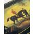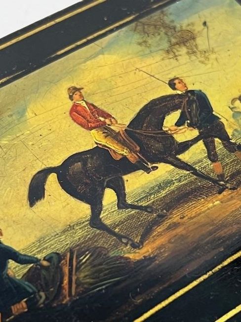AN EARLY 19TH GERMAN STOBWASSER TYPE PAINTED LACQUER CARD CASE OF RACING THEMEof rectangular form with curved ends, painted with a scene of two jockeys on horses in a landscape, on a black ground, the reverse plain black, the interior leather,14cm wide