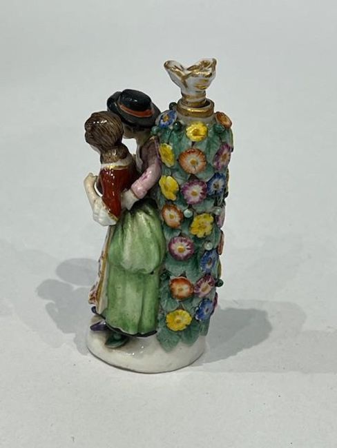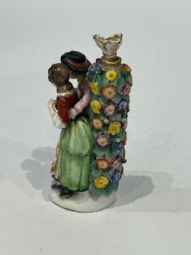 A 19TH CENTURY PORCELAIN FIGURAL SCENT BOTTLE, POSSIBLY CHELSEAin the 18th century style, depicting a courting couple beside a flower encrusted column, with floral stopper, unmarked,9.5cm high