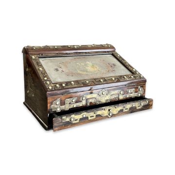 A VICTORIAN ORMOLU AND MOTHER OF PEARL INLAID WRITING BOXthe sloping fall front above a fitted drawer and with a painted panel of glass, with ormolu mounts and mother of pearl beaded decoration, opening to a velvet lined interior with a pair of inkpots,32cm wide