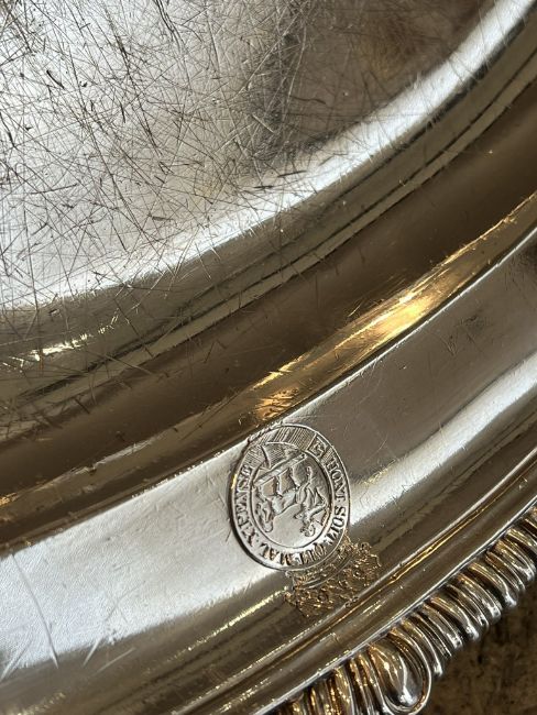 PAUL STORR: A LARGE STERLING SILVER MEAT PLATTER, C. 1810 FOR THE EARL OF SHREWSBURYthe early 19th century George III / Regency period meat dish of oval form with gadrooned rim, with engraved heraldic crest to the rim and motto 'honi soit qui mal y pense' relating to the Order of the Garter, with a centaur with bow, relating toCharles Talbot (1764–1827), 15th Earl of Shrewsbury who was a Knight of the Garter, hallmarked to underside London, 1810, PS for Paul Storr,3575g (114.93 oz. t.)56cm x 40cm