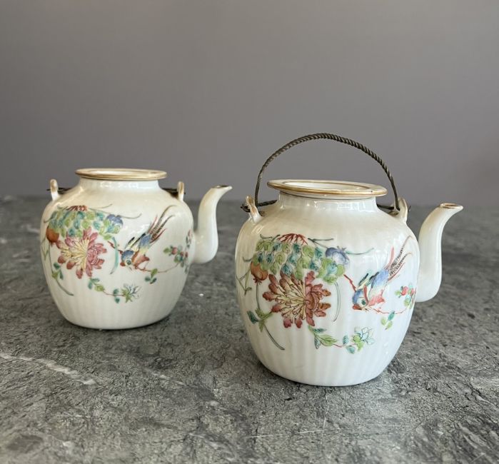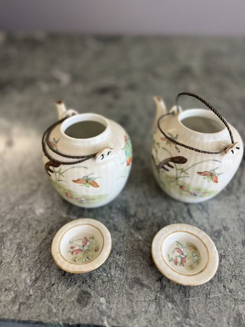 A PAIR OF CHINESE QING DYNASTY FAMILLE ROSE PORCELAIN TEAPOTSlate 19th / early 20th century, each with a removable circular cover decorate with a butterfly, with metal rope twist handle over, the bodies decorated with butterflies on a white ground, with applied seal mark to underside of one,10cm high (2)