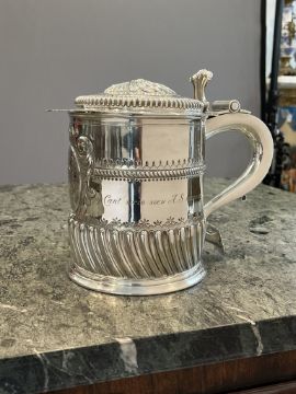 A MASSIVE BRITANNIA SILVER TANKARD BY WILLIAM COMYNS, RELATING TO TRINITY COLLEGEthe George V period antique early 20th century silver tankard in the 18th century style, with hinged gadrooned cover with floral patera to the top and scroll handle, the body with gadrooned base over circular foot, the centre with a cartouche engraved with the heraldic crest for Trinity College Cambridge, with inscription around the body 'W.W. Rouse Ball Coll S.S. Trin...' hallmarked with Brittania mark and date letter for 1913, maker's mark for William Comyns,1910g (61.40 oz. t.)24cm high x 28cm wideGood condition.