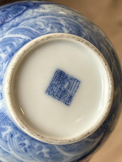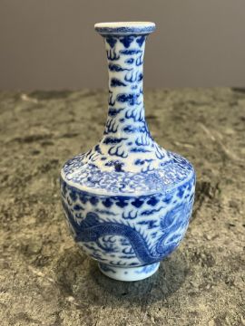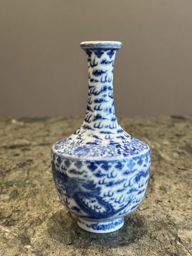A 19TH CENTURY CHINESE PORCELAIN BLUE AND WHITE PORCELAIN DRAGON VASEQing dynasty, with Qianlong mark to underside, of baluster form with elongated neck, on circular foot, decorated with dragons and stylised clouds,17cm high