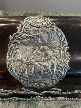 AN EARLY 20TH CENTURY TORTOISESHELL AND SILVER MOUNTED DESK SET, WILLIAM COMYNS & SONSthe antique Victorian set comprising a stationary box and blotter, the box with serpentine shaped hinged lid decorated with a silver relief of a courting couple, within an ornate Rococo style border with acanthus leaves and C scrolls, opening to a fitted interior lined with watered silk, with compartments for letters, hallmarked London, 1900, the blotter also with silver mount, hallmarked 1903, both with maker's mark WC for William Comyns & Sons,the box 29cm wide, the blotter pad 30cm wide (2)This lot is subject to CITES due to the fortoiseshell content.