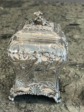 A SET OF THREE GEORGE III STERLING SILVER TEA CADDIES, LONDON, 1772, MARKS FOR EMICK ROMERthe 18th century Georgian antique tea caddy set comprising one larger and a pair smaller, all with Rococo decoration, hinged covers with foliate finials and C scrolls and shells to the bodies, all hallmarked to underside, London, 1772, maker's mark ER for Emick Romer,755g (24.27 oz. t.)the largest 13.5cm high (3)