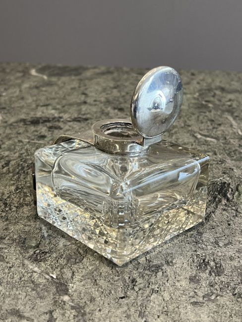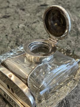AN EARLY 20TH CENTURY STERLING SILVER AND GLASS CALENDAR INKWELL C.1908Art Deco period, antique Edward VII, the glass inkpot of square form with canted angle, with silver mounts, hinged circular cover and calendar section to the front, with changeable ivorine plaques listing the months of the year, with a switch to change the date, hallmarked Birmingham, 1908, 10cm wide