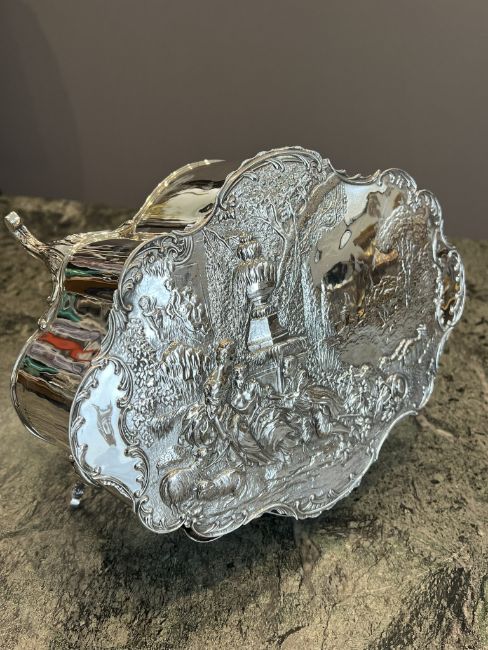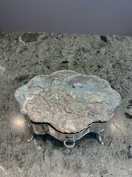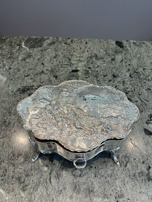 A FINE EARLY 20TH CENTURY STERLING SILVER JEWELLERY BOX, C.1901, WILLIAM COMYNSthe Edwardian antique jewellery casket in the Rococo style, the repousse top decorated with a scene of two 18th century shepherdesses courted by a young man, with sheep beside, within an arcadian landscape, within a C scroll border, the shaped body of the box with a fitted frieze drawer with floral garland handle, raised on four cabriole legs, hallmarked London, 1901, maker's mark for William Comyns,1025g including wood lining29cm wide x 11cm high