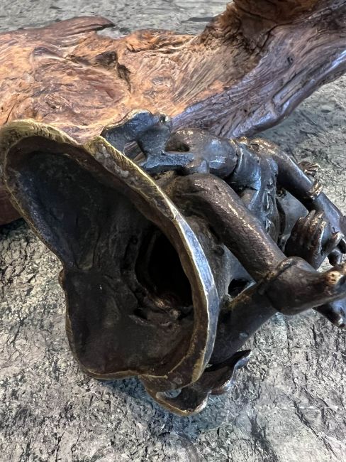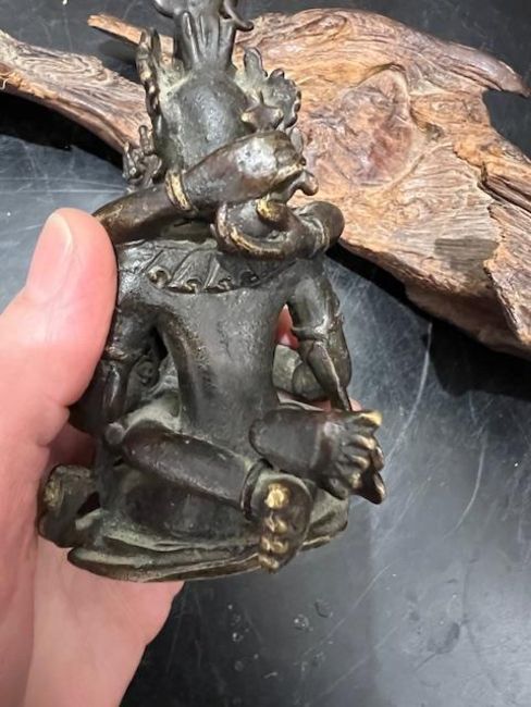 AN 18TH / 19TH CENTURY TIBETAN BRONZE FIGURE OF HERUKA ON SANDALWOOD BASEthe Buddhist figure Nepalese or Tibetan, depicting the tantric deity in an erotic embrace with his consort Vajrayogini, raised on a sandalwood roughly hewn base,the figure 11cm high, the base 36cm wide