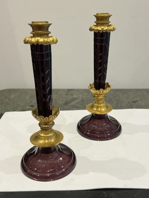 A PAIR OF 19TH / 20TH CENTURY RUSSIAN AMETHYST GLASS AND ORMOLU CANDLESTICKSin the Empire style, the tapering stems decorated with floral motifs, raised on faceted circular feet, with ormolu mounts and foliate collars,27cm high (2)