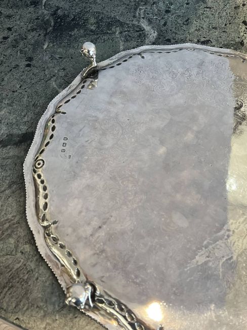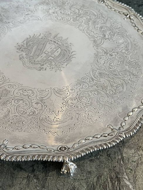 A GEORGE III STERLING SILVER SALVER, LONDON, 1774, MARKS FOR RICHARD RUGG Ithe 18th century Georgian shaped tray raised on four claw and ball, of scalloped outline, with gadrooned rim, with garlands of trailing husk to the rim enclosing engraved foliate scrollwork, centred by a heraldic crest for the Balfour family with the motto 'Posse Nolle Nobile' hallmarked London, 1774, maker's mark RR probably for Richard Rugg I,2500g (80.37 oz. t.)45cm wide x 5cm high Good condition.